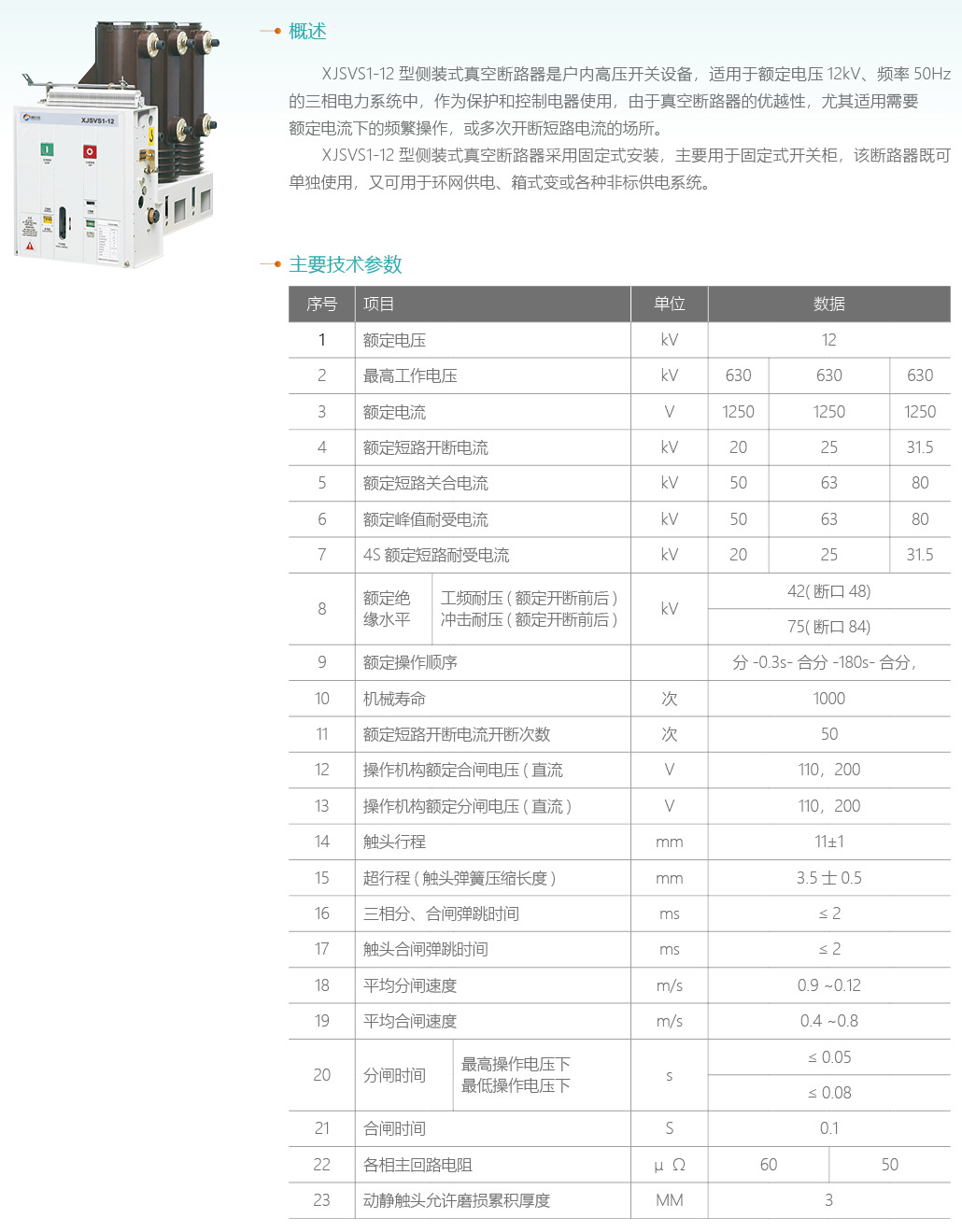 XJSVS1-12側裝式戶內高壓真空斷路器